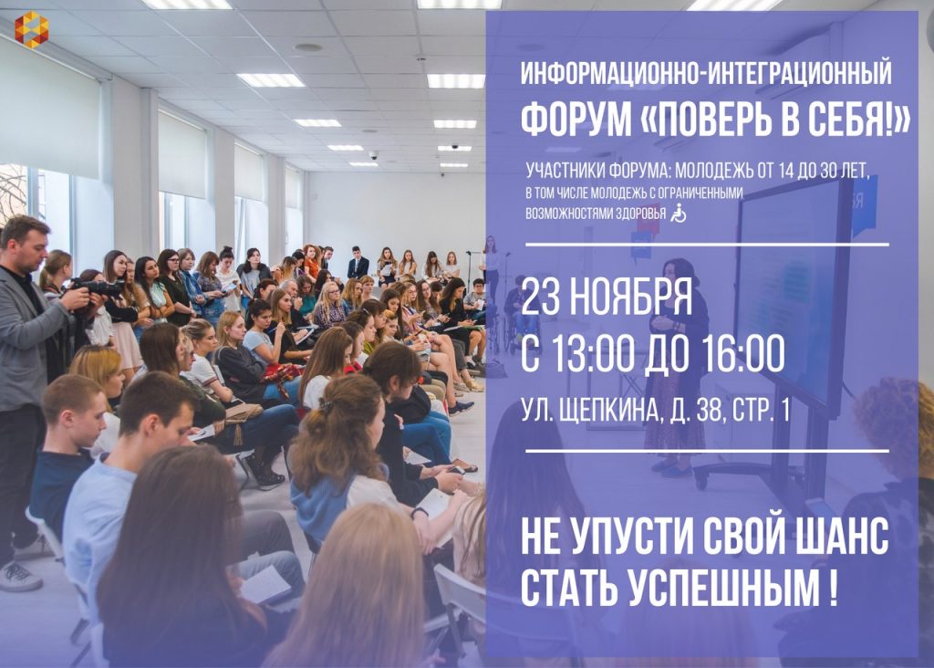 23 ноября с 13:00 до 16:00 в ГКУ «Центр занятости молодежи города Москвы» будет проходить информационно-интеграционный форум «Поверь в себя!».
